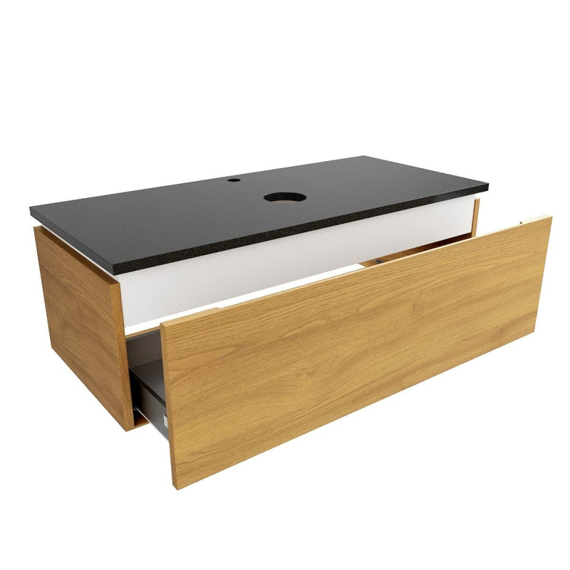 Závesná kúpeľňová skrinka so žulovou krycou doskou vo farebnom prevedení medový dub s matným povrchom o rozmere 100x30x46 cm. Povrch v prevedení lamino.
