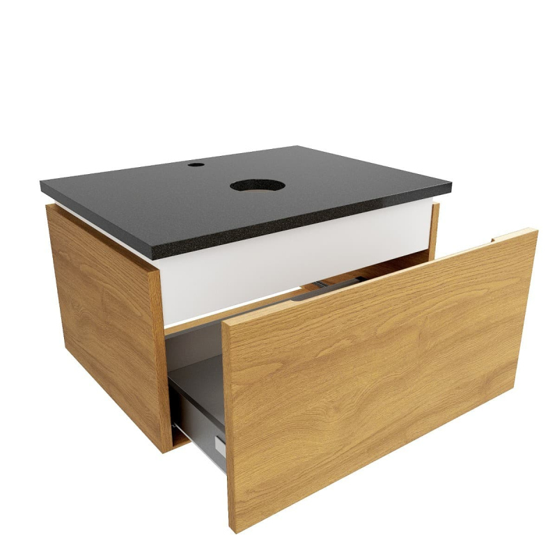 Závesná kúpeľňová skrinka so žulovou krycou doskou vo farebnom prevedení medový dub s matným povrchom o rozmere 60x30x46 cm. Povrch v prevedení lamino.