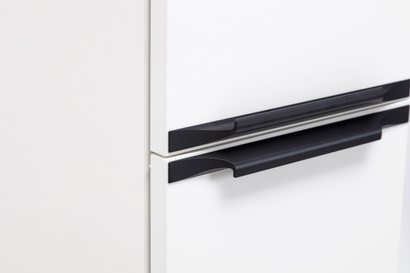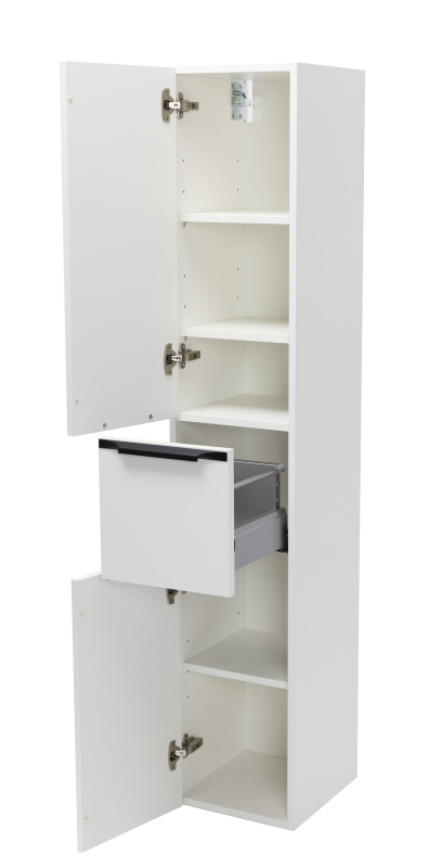 Vysoká skrinka do kúpeľne 158 cm, biela lesk, s dvoma dvierkami a malou zásuvkou, čierne matné úchytky.