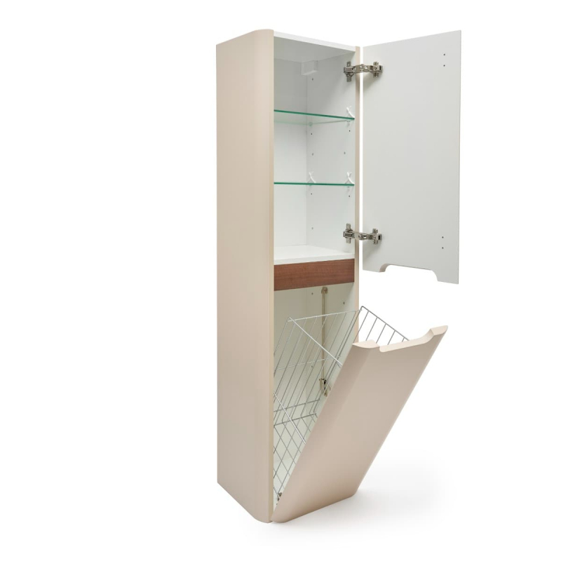 Závesná kúpeľňová skrinka vysoká vo farebnom prevedení pieskovo béžová s matným povrchom o rozmere 40x149x33 cm.