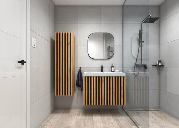 Závesná kúpeľňová skrinka vysoká v dekore dub v matnom prevedení o rozmere 34x125x36 cm. S plnovýsuvom a doťahom.