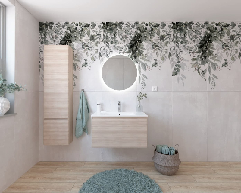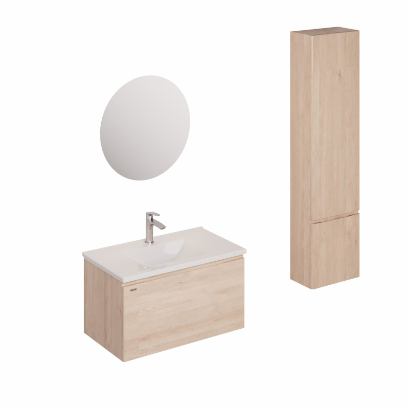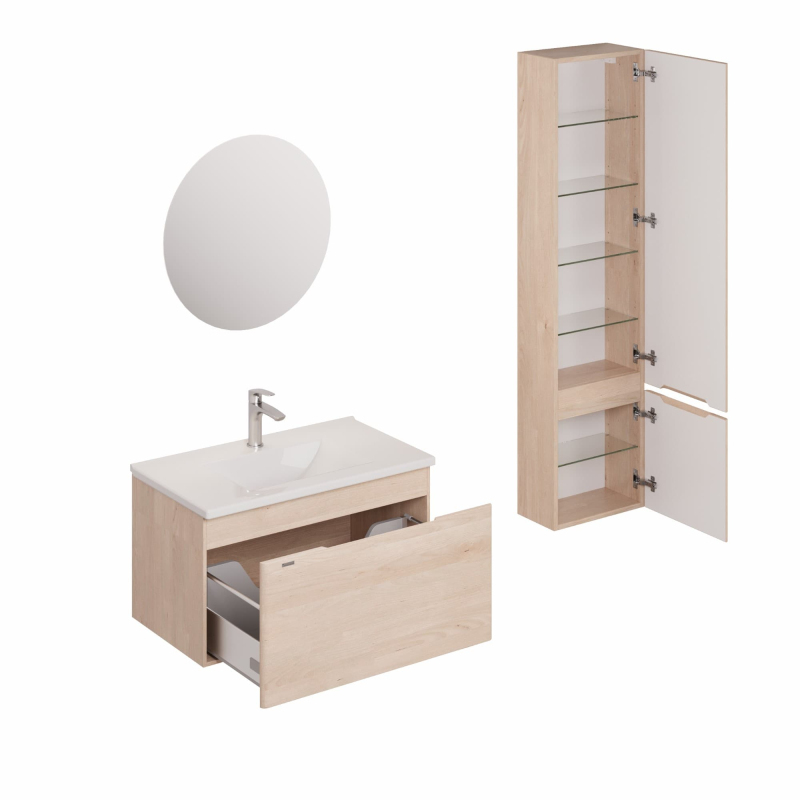 Závesná kúpeľňová zostava s keramickým umývadlom v dekore akácie s fóliovaným povrchom. S plnovýsuvom a doťahom.