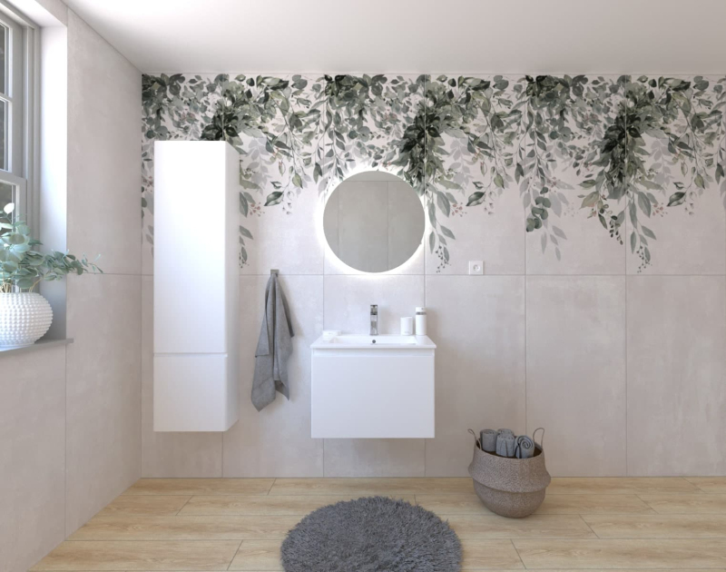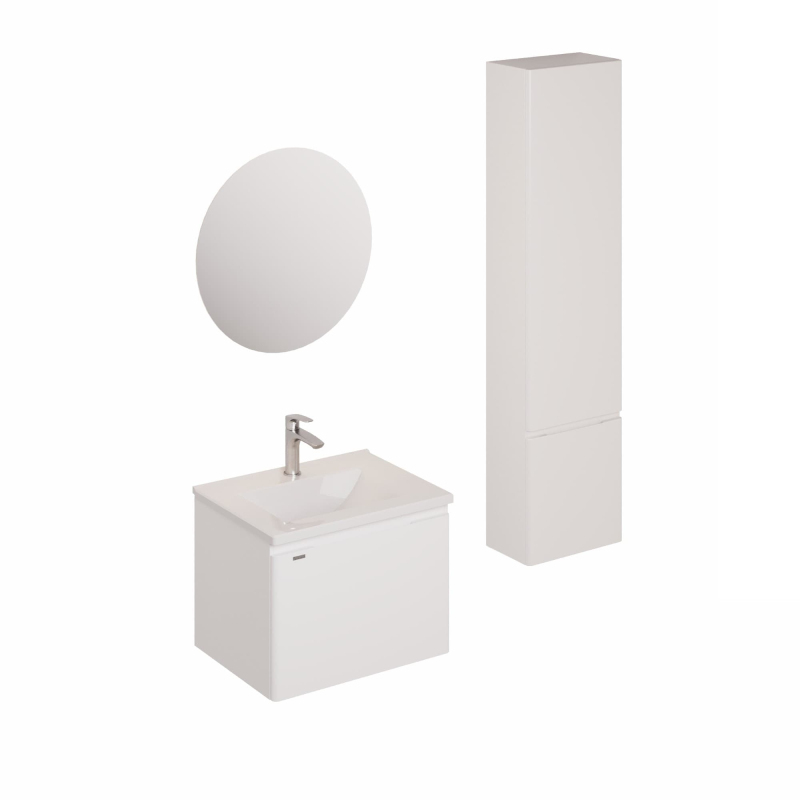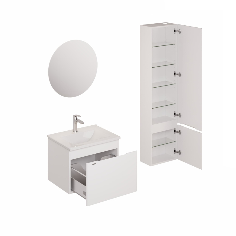 Závesná kúpeľňová zostava s keramickým umývadlom v bielej farbe s fóliovaným povrchom. S plnovýsuvom a doťahom.