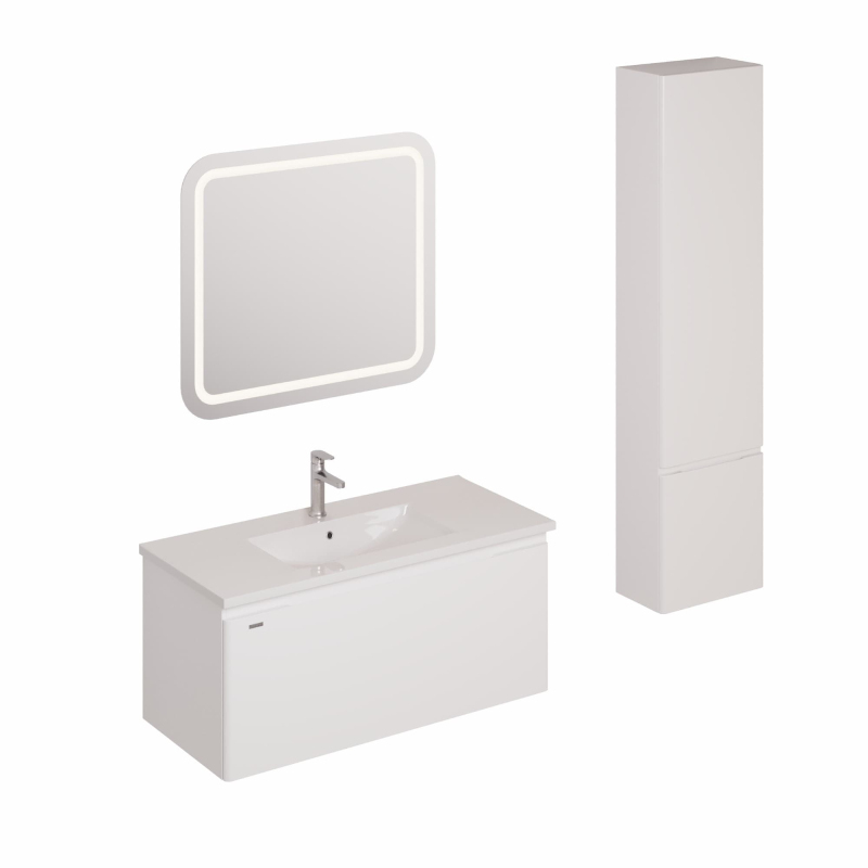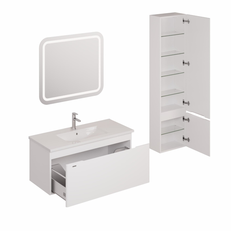 Závesná kúpeľňová zostava s keramickým umývadlom v bielej farbe s fóliovaným povrchom. S plnovýsuvom a doťahom.