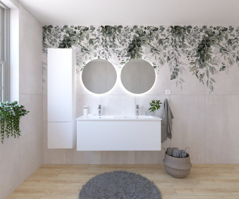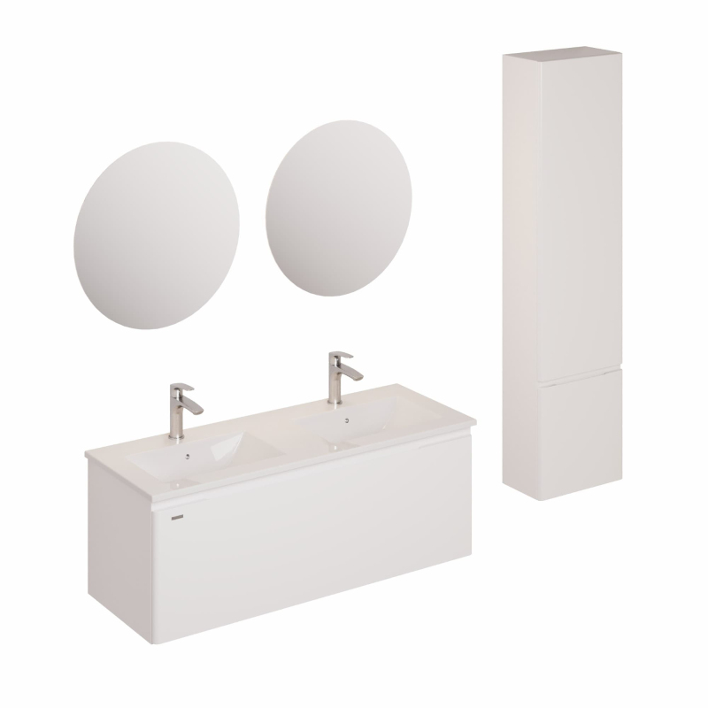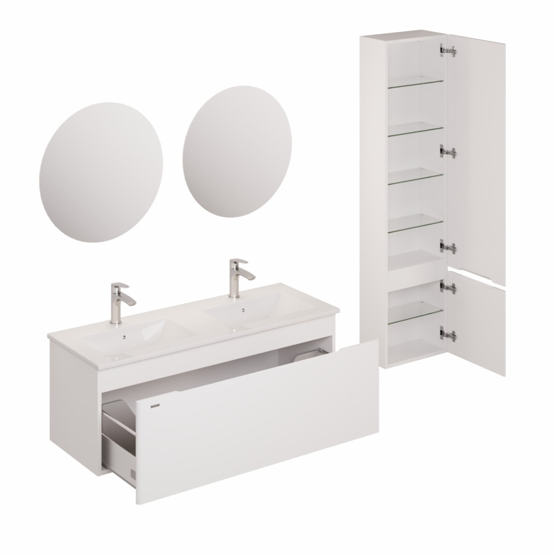Závesná kúpeľňová zostava s keramickým umývadlom v bielej farbe s fóliovaným povrchom. S plnovýsuvom a doťahom.