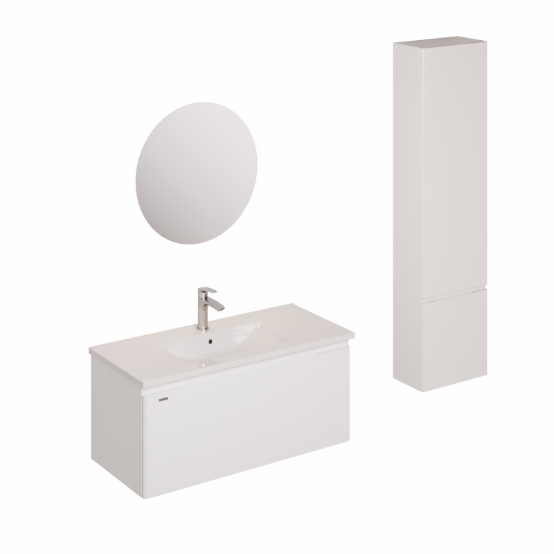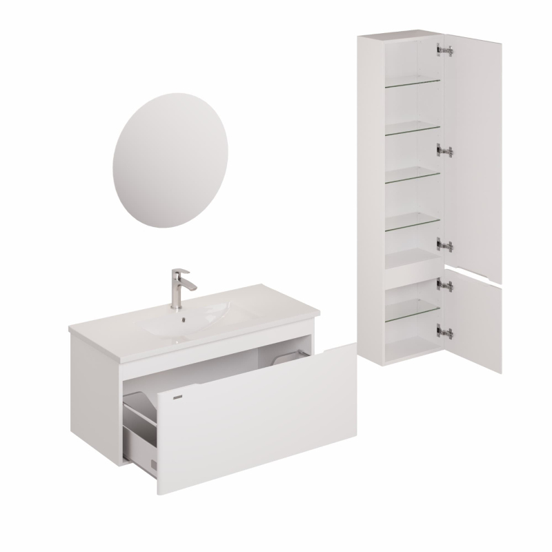 Závesná kúpeľňová zostava s keramickým umývadlom v bielej farbe s fóliovaným povrchom. S plnovýsuvom a doťahom.