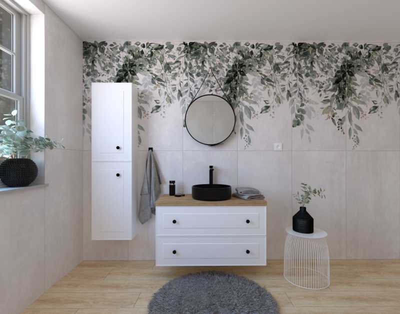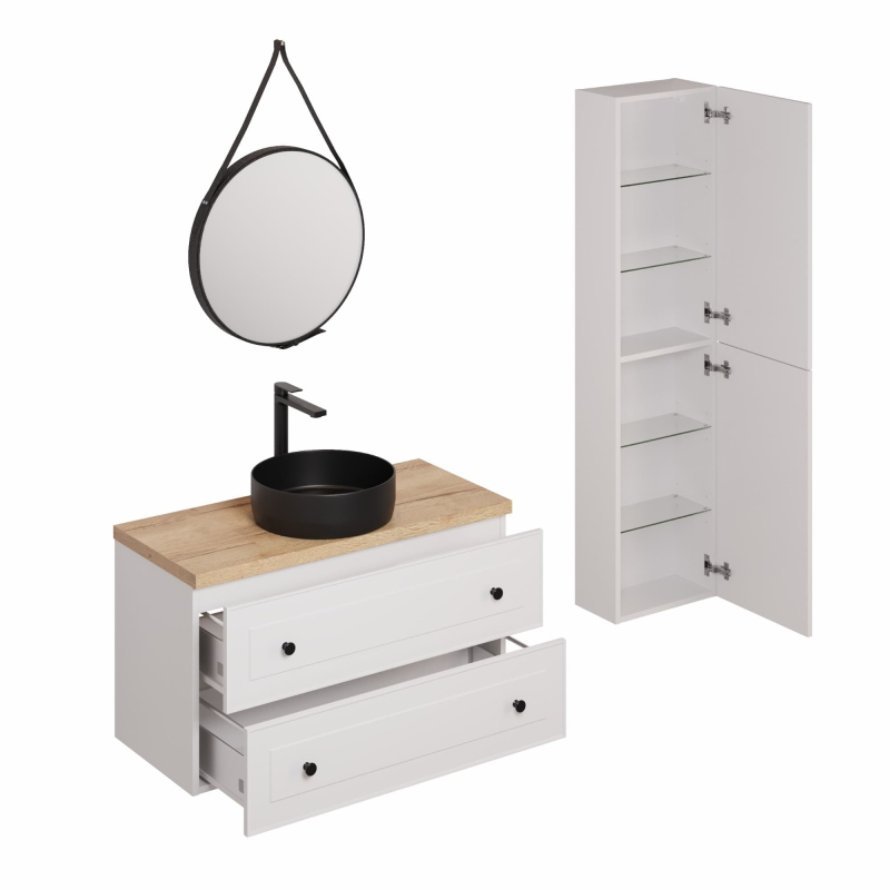 Závesná kúpeľňová zostava s keramickým umývadlom v bielej farbe s fóliovaným povrchom. S plnovýsuvom a doťahom.