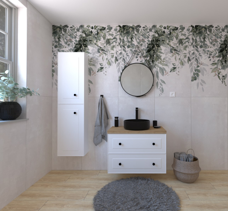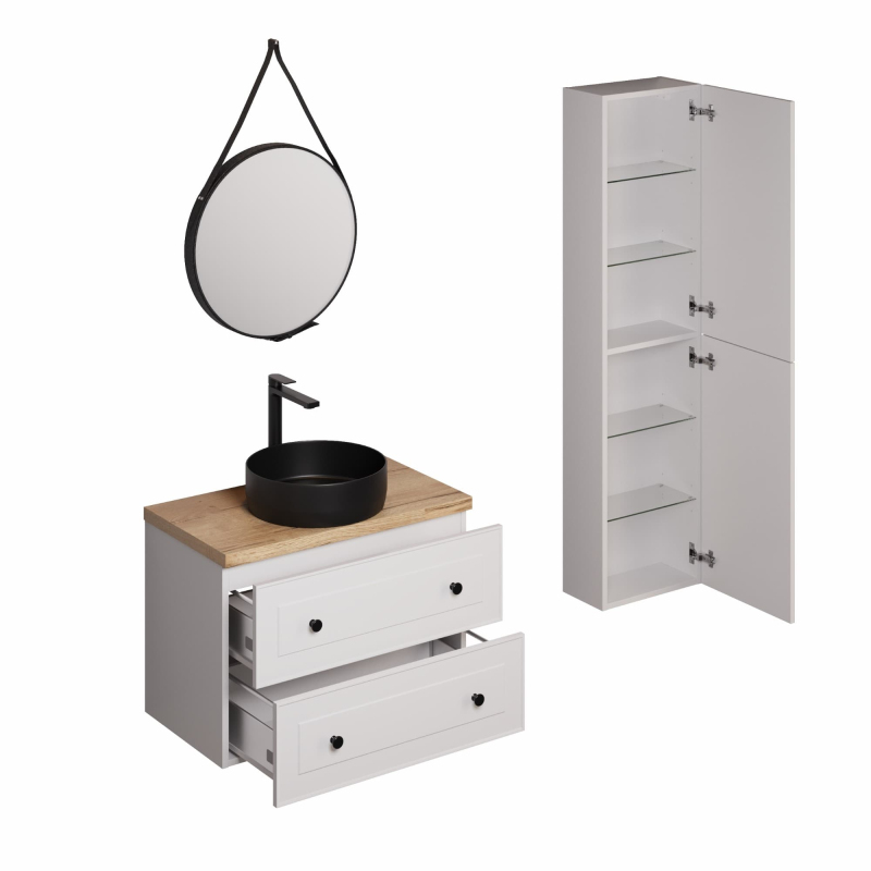Závesná kúpeľňová zostava s keramickým umývadlom v bielej farbe s fóliovaným povrchom. S plnovýsuvom a doťahom.