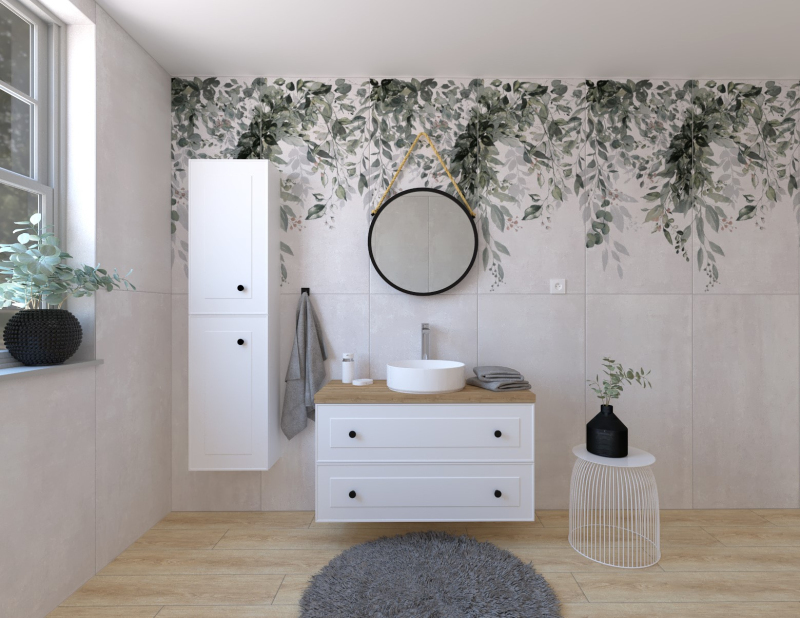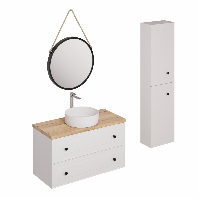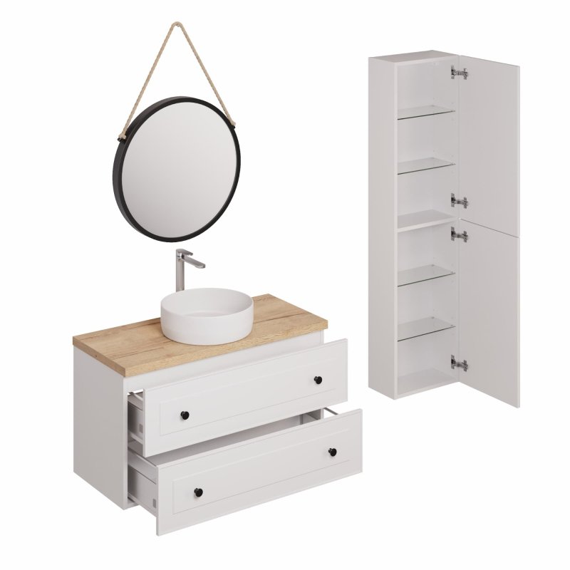 Závesná kúpeľňová zostava s keramickým umývadlom v bielej farbe s fóliovaným povrchom. S plnovýsuvom a doťahom.