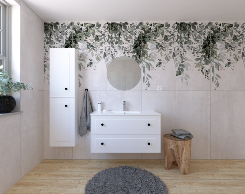 Závesná kúpeľňová zostava s keramickým umývadlom v bielej farbe s fóliovaným povrchom. S plnovýsuvom a doťahom.
