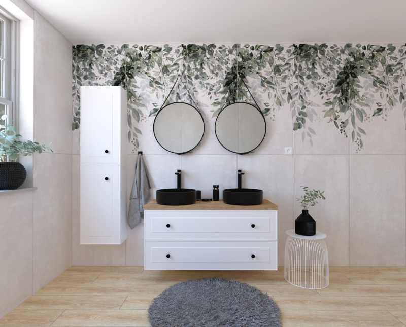 Závesná kúpeľňová zostava s keramickým umývadlom v bielej farbe s fóliovaným povrchom. S plnovýsuvom a doťahom.