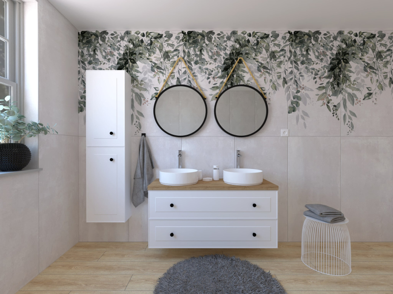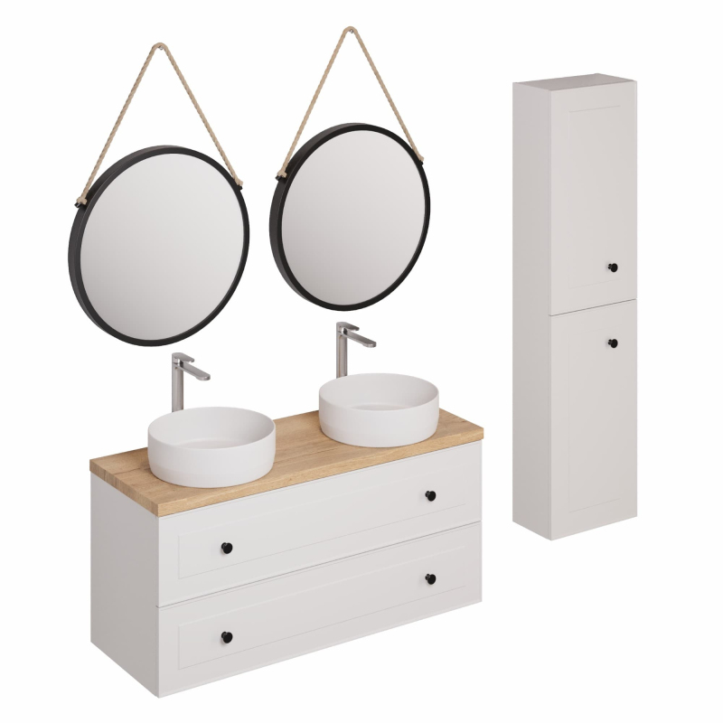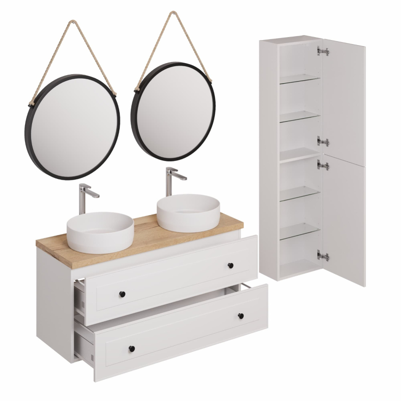 Závesná kúpeľňová zostava s keramickým umývadlom v bielej farbe s fóliovaným povrchom. S plnovýsuvom a doťahom.