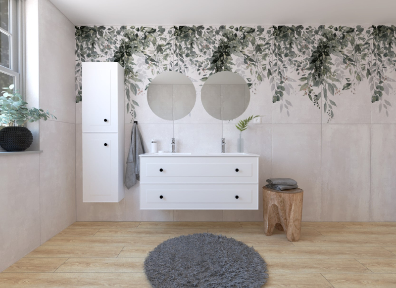 Závesná kúpeľňová zostava s keramickým umývadlom v bielej farbe s fóliovaným povrchom. S plnovýsuvom a doťahom.