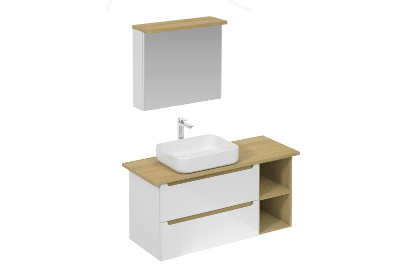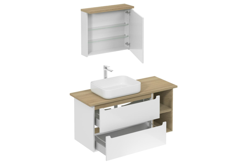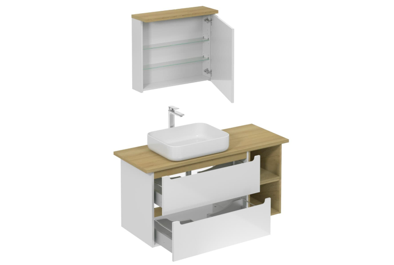 Závesná kúpeľňová zostava s keramickým umývadlom v bielej farbe s lesklým povrchom s fóliovaným povrchom. S plnovýsuvom a doťahom.