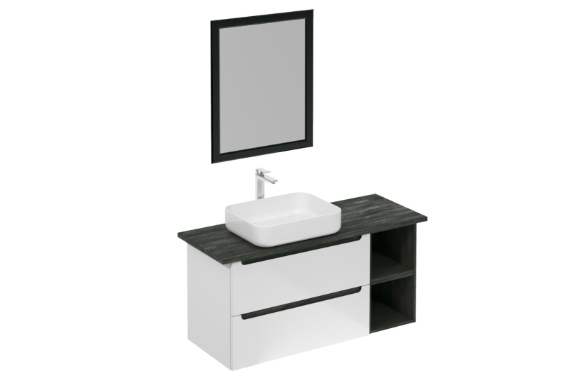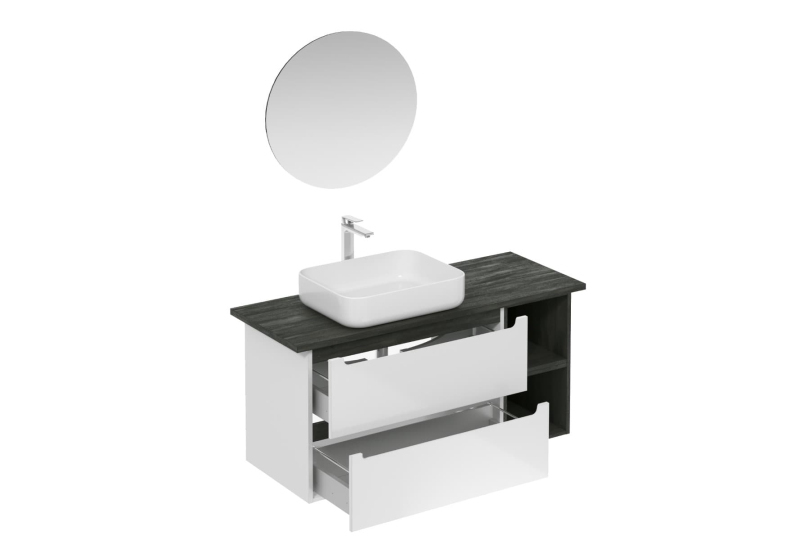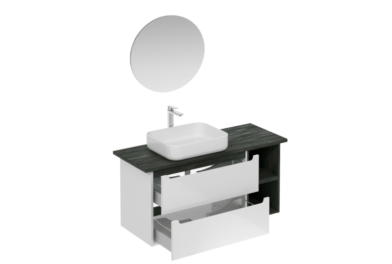 Závesná kúpeľňová zostava s keramickým umývadlom v bielej farbe s lesklým povrchom s fóliovaným povrchom. S plnovýsuvom a doťahom.
