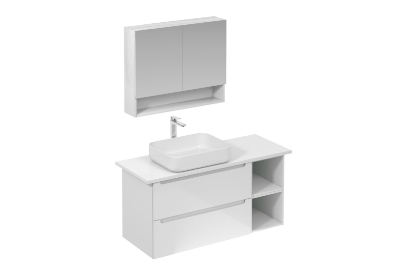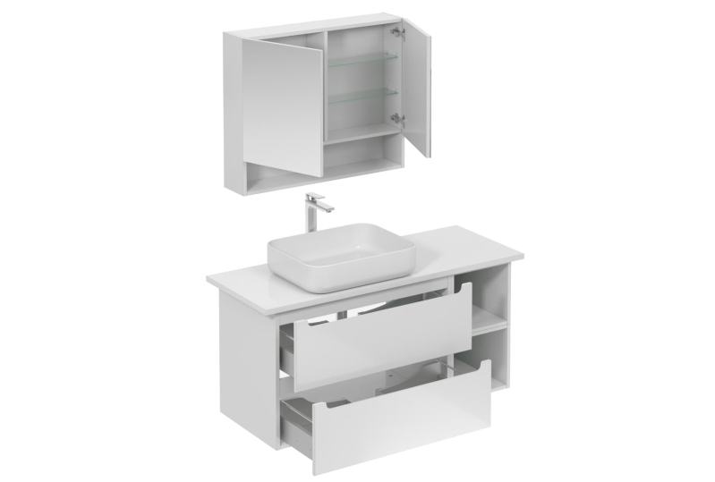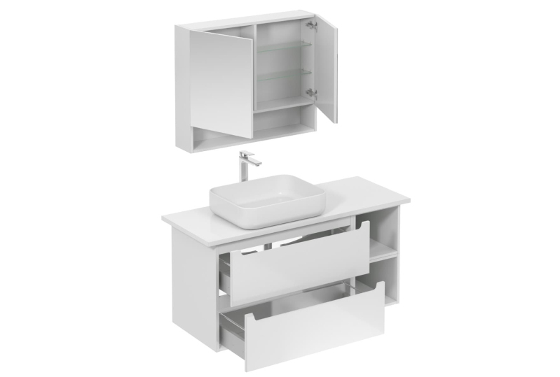 Závesná kúpeľňová zostava s keramickým umývadlom v bielej farbe s lesklým povrchom s fóliovaným povrchom. S plnovýsuvom a doťahom.