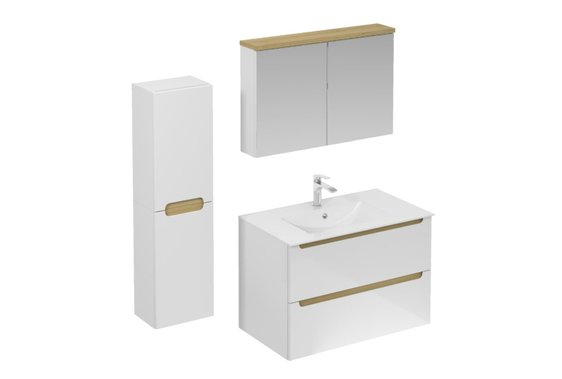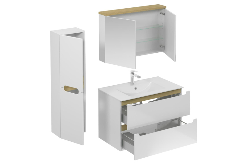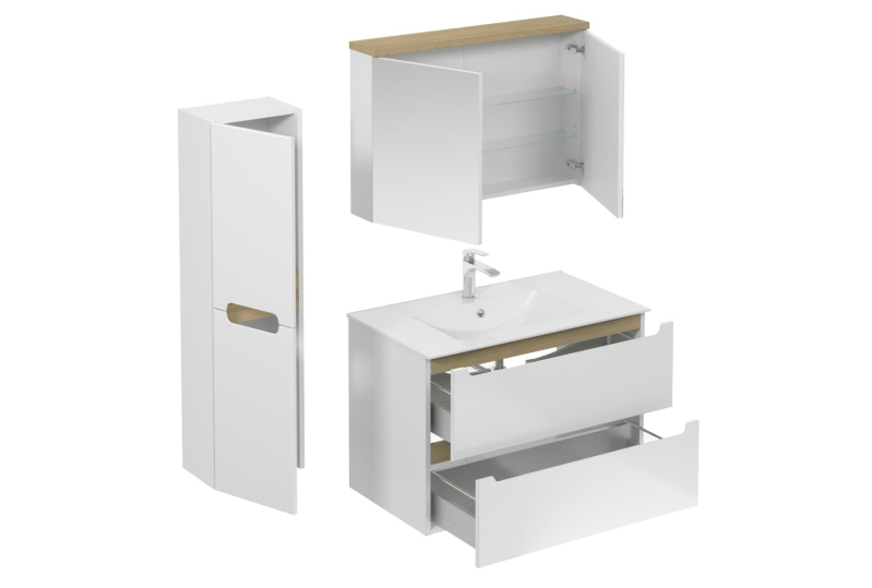 Závesná kúpeľňová zostava s keramickým umývadlom v bielej farbe s lesklým povrchom s fóliovaným povrchom. S plnovýsuvom a doťahom.