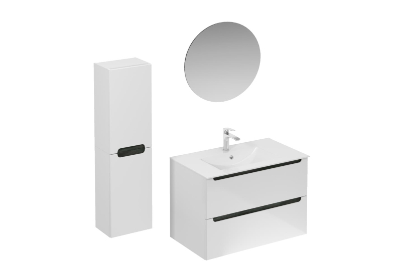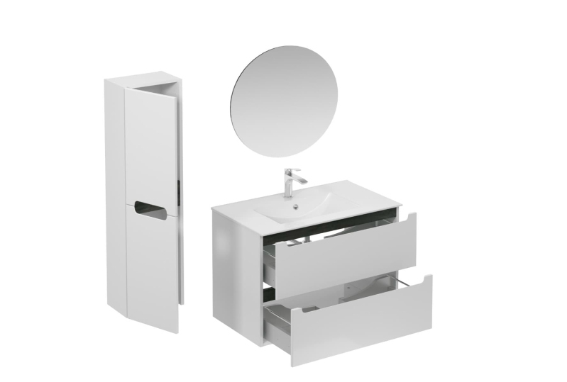 Závesná kúpeľňová zostava s keramickým umývadlom v bielej farbe s lesklým povrchom s fóliovaným povrchom. S plnovýsuvom a doťahom.