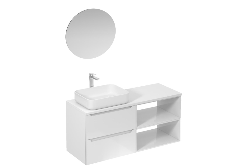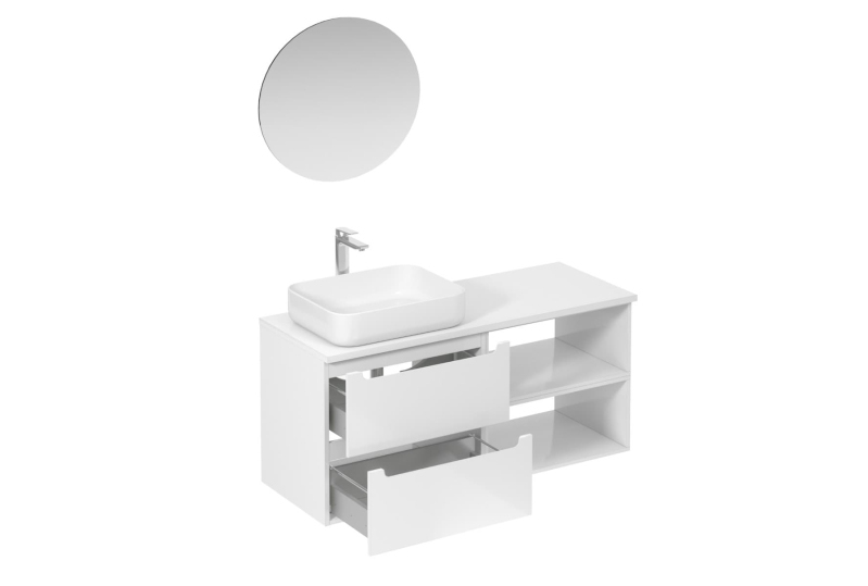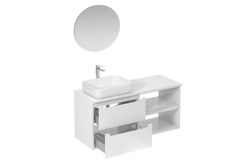 Závesná kúpeľňová zostava s keramickým umývadlom v bielej farbe s lesklým povrchom s fóliovaným povrchom. S plnovýsuvom a doťahom.