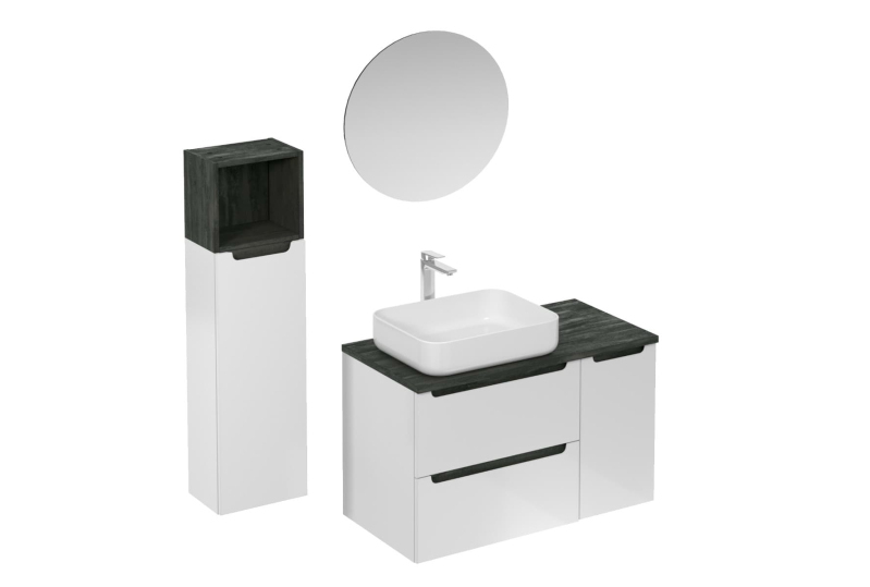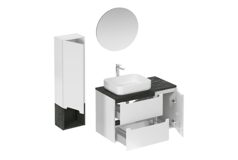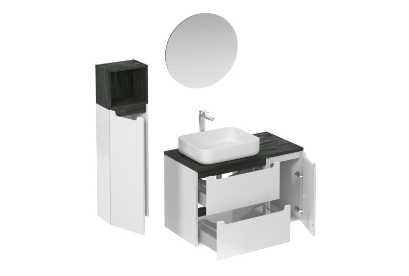 Závesná kúpeľňová zostava s keramickým umývadlom v bielej farbe s lesklým povrchom s fóliovaným povrchom. S plnovýsuvom a doťahom.