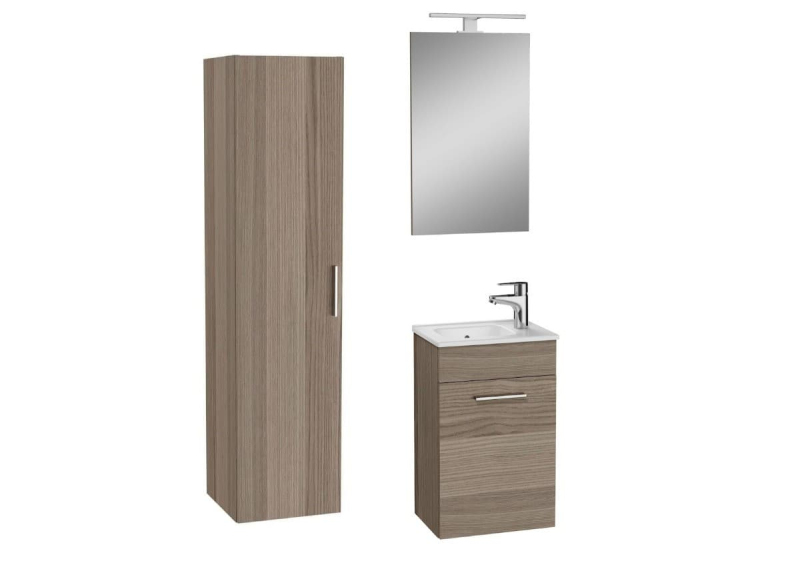 Závesná kúpeľňová zostava v drevodekore cordoba s keramickým umývadlom. Šírka umývadlovej skrinky je 40 cm.