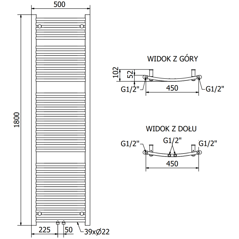 Technické údaje: Výška: 1800 mm Šírka: 500 mm Hĺbka: 52 mm Rozstup pripojenia: - 45 cm (dole) alebo 5 cm (uprostred) Farba: Čierna RAL 9005 Materiál: Oceľ Hmotnosť: 12,65 kg Reakcia na oheň: A0 Prevádzková teplota: 0 max. výkon: - 75/65/20 °C - 820 W Pripojenie: - 2xG ½″ uprostred - 4xG ½″ zhora a zdola na pravej alebo ľavej strane Možnosť inštalácie výhrevného telesa Vysoko kvalitný, odolný, nehrdzavejúci náter Sada obsahuje: zavesenie, montážnu sadu, záslepky