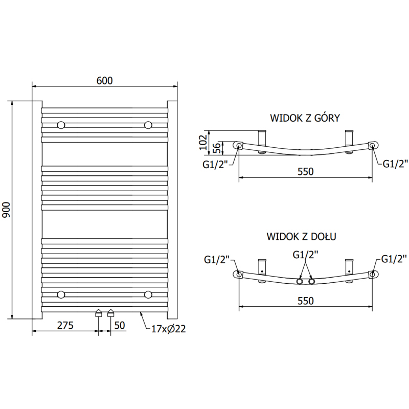 Technické údaje: Výška: 900 mm Šírka: 600 mm Hĺbka: 56 mm Rozstup pripojenia: - 55 cm (dole) alebo 5 cm (uprostred) Farba: Biela RAL 9016 Materiál: Oceľ Hmotnosť: 6,83 kg Reakcia na oheň: A9 Prevádzková teplota: Maximálna max. výkon: - 75/65/20 °C - 433 W Pripojenie: - 2xG ½″ uprostred - 4xG ½″ zhora a zdola na pravej alebo ľavej strane Možnosť inštalácie výhrevného telesa Vysoko kvalitný, odolný, nehrdzavejúci náter Sada obsahuje: zavesenie, montážnu sadu, záslepky