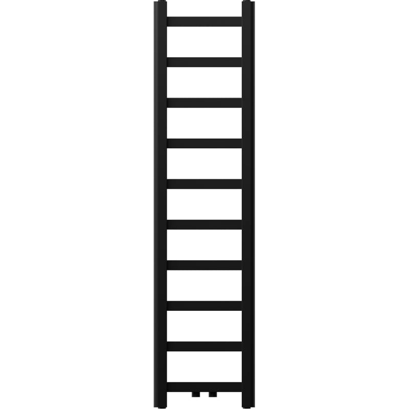 Technické údaje: Výška: 1200 mm Šírka: 300 mm Hĺbka: 40 mm Rozstup pripojenia: - 25 cm (dole) alebo 5 cm (uprostred) Farba: Čierna RAL 9005 Materiál: Oceľ Hmotnosť: 5,05 kg Reakcia na oheň: A9 Prevádzková teplota: Maximálna max. výkon: - 75/65/20 °C - 240 W Pripojenie: - 2xG ½″ uprostred - 4xG ½″ zhora a zdola na pravej alebo ľavej strane Možnosť inštalácie výhrevného telesa Vysoko kvalitný, odolný, nehrdzavejúci náter Sada obsahuje: zavesenie, montážnu sadu, záslepky