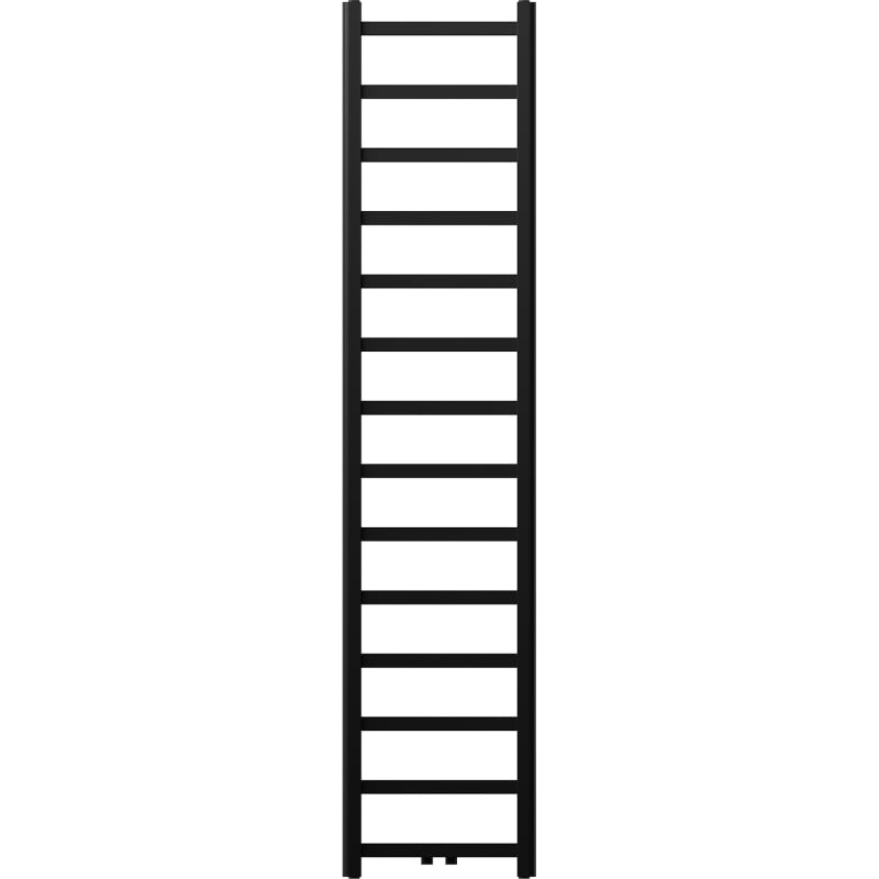 Technické údaje: Výška: 1800 mm Šírka: 400 mm Hĺbka: 40 mm Rozstup pripojenia: - 35 cm (dole) alebo 5 cm (uprostred) Farba: Čierna RAL 9005 Materiál: Oceľ Hmotnosť: 8,20 kg Reakcia na oheň: A9 Prevádzková teplota: Maximálna max. výkon: - 75/65/20 °C - 406 W Pripojenie: - 2xG ½″ uprostred - 4xG ½″ zhora a zdola na pravej alebo ľavej strane Možnosť inštalácie výhrevného telesa Vysoko kvalitný, odolný náter odolný proti korózii Sada obsahuje: závesy, montážnu sadu, záslepky a odev