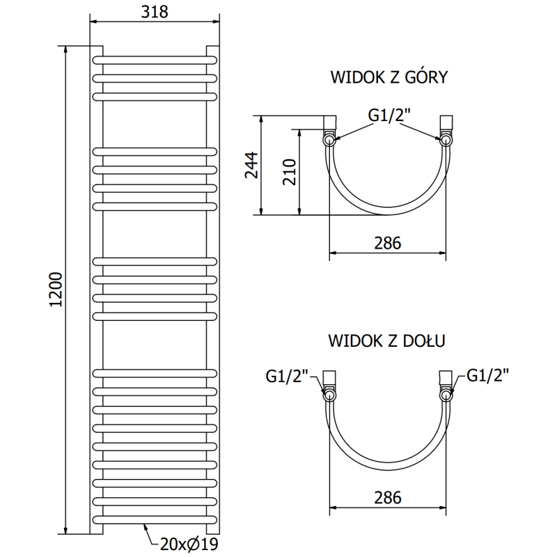 Technické údaje: Výška: 1200 mm Šírka: 318 mm Hĺbka: 210 mm Rozstup pripojenia: 28,6 cm Farba: Antracitová RAL 7016 Materiál: Oceľ Hmotnosť: 6,94 kg Reakcia na oheň: A1 Prevádzková teplota: max. 95 °C Maximálna prevádzková 75/65/20 °C - 421 W Pripojenie: - 4xG ½″ zhora a zdola na pravej alebo ľavej strane Možnosť inštalácie výhrevného telesa Vysoko kvalitný, odolný, nehrdzavejúci náter Sada obsahuje: závesy, montážnu sadu, záslepky a odvzdušňovací otvor