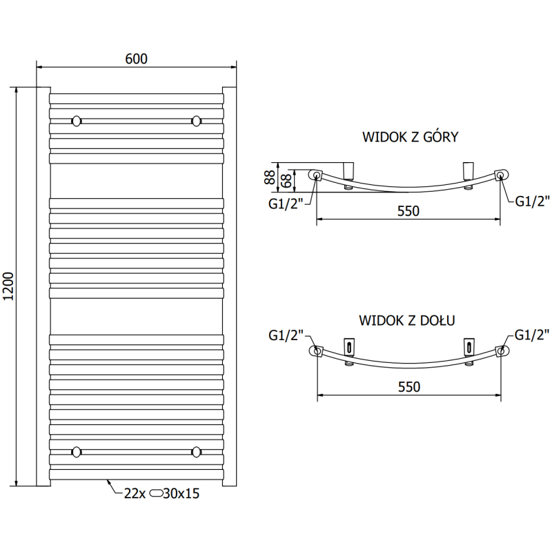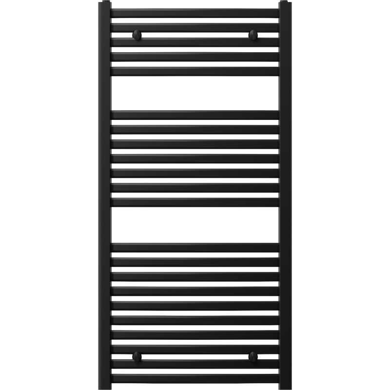 Technické údaje: Výška: 1200 mm Šírka: 600 mm Hĺbka: 68 mm Rozstup pripojenia: 55 cm Farba: Čierna RAL 9005 Materiál: Oceľ Hmotnosť: 11,05 kg Reakcia na oheň: A1 Prevádzková teplota: max. 95 °C Maximálny prevádzkový tlak: 0 °C - 563 W Pripojenie: - 4xG ½″ zhora a zdola na pravej alebo ľavej strane Možnosť inštalácie výhrevného telesa Vysoko kvalitný, odolný náter proti korózii Sada obsahuje: závesy, montážnu sadu, záslepky a odvzdušňovací otvor