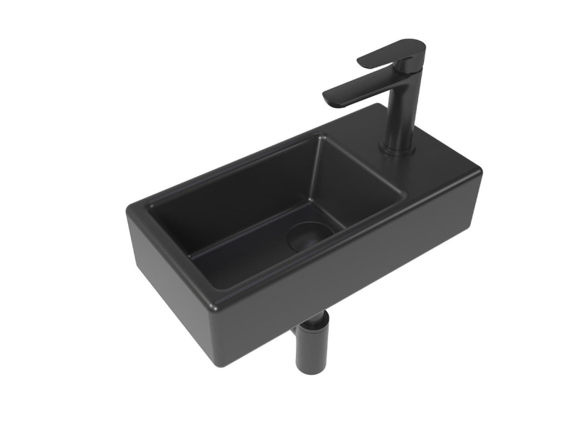 Kúpeľňový set pravého závesného umývadla Brevis 40,5 cm, pákové batérie, sifónu, prietokové zátky a roháčikov v čiernej farbe KSETBRE2PBKM