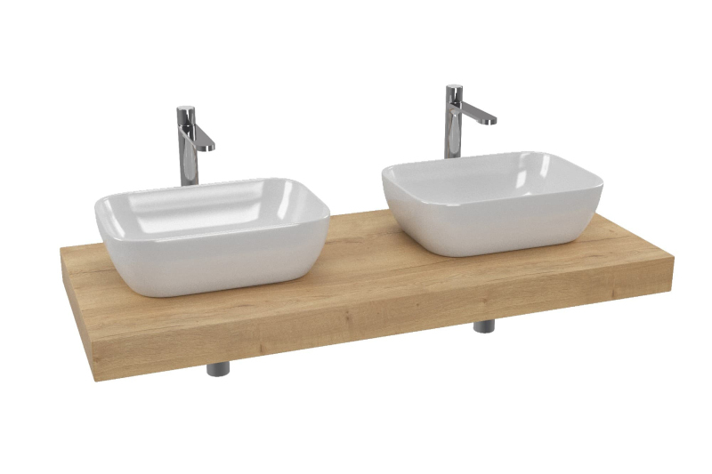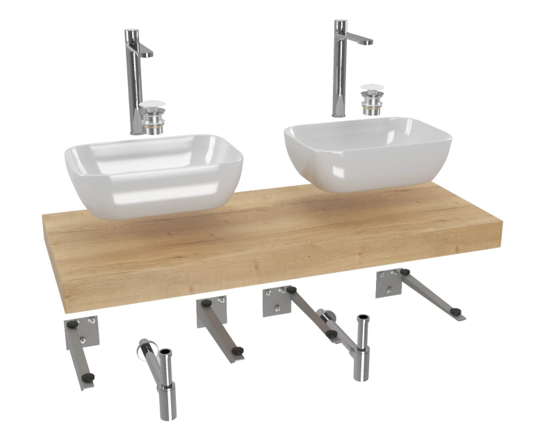 Cenovo zvýhodnený kúpeľňový set sa skladá z trinástich výrobkov - vodovodné batérie 2x, umývadlo 2x, doska pod umývadlo, zátka 2x, sifón 2x, konzola 4x