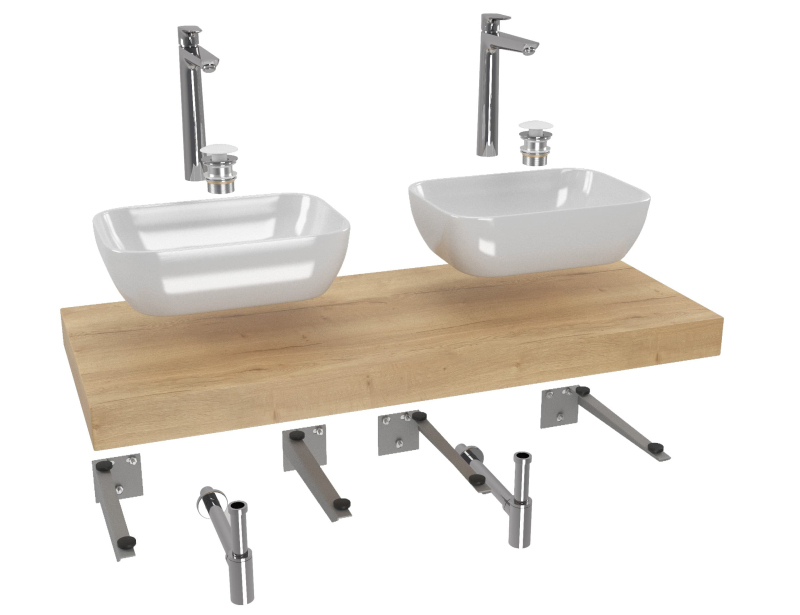 Cenovo zvýhodnený kúpeľňový set sa skladá z trinástich výrobkov - vodovodné batérie 2x, umývadlo 2x, doska pod umývadlo, zátka 2x, sifón 2x, konzola 4x