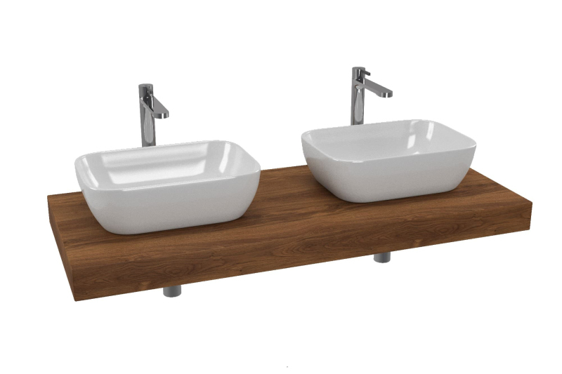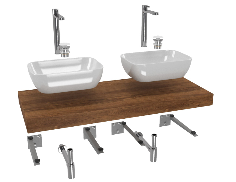 Cenovo zvýhodnený kúpeľňový set sa skladá z trinástich výrobkov - vodovodné batérie 2x, umývadlo 2x, doska pod umývadlo, zátka 2x, sifón 2x, konzola 4x