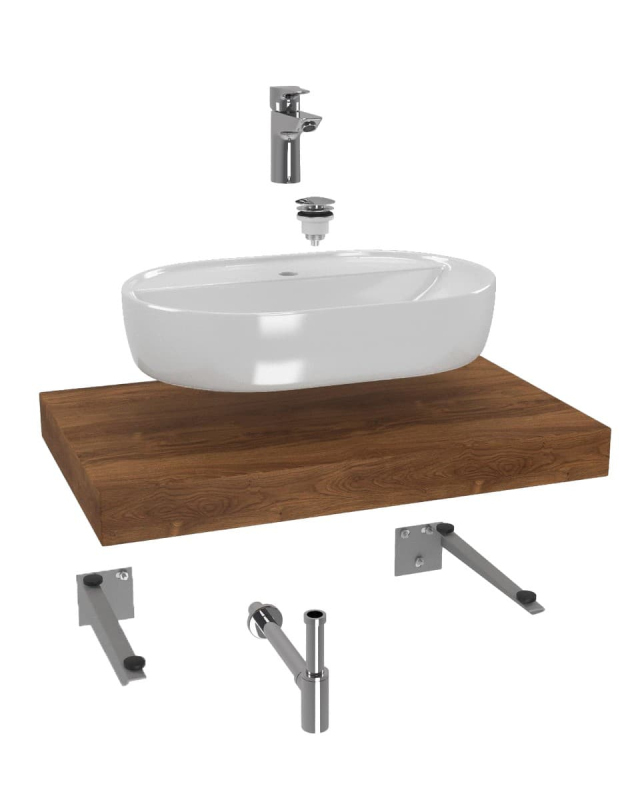 Cenovo zvýhodnený kúpeľňový set sa skladá zo siedmich výrobkov - vodovodné batérie, umývadlo, doska pod umývadlo, zátka (súčasť batérie), sifón, konzola 2x