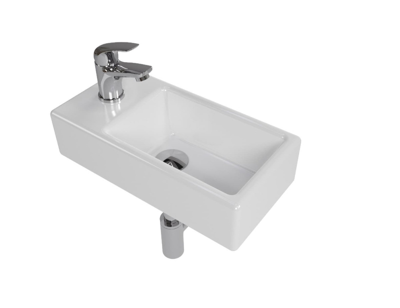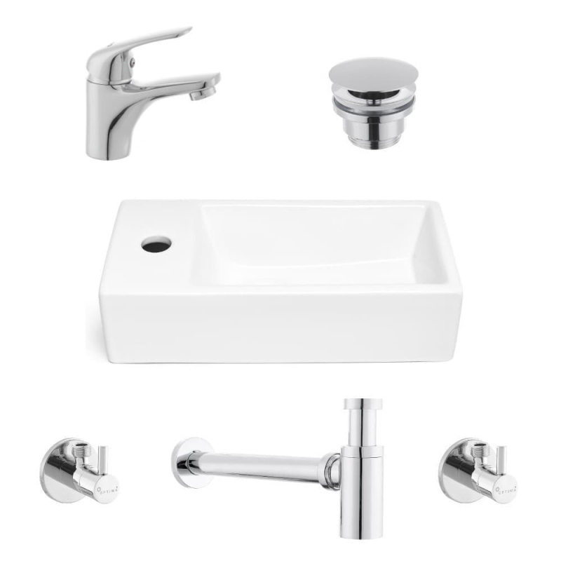Súčasťou setu je ľavé keramické umývadlo Brevis v bielej farbe, chrómová páková batéria a tiež dizajnový sifón, 2 ks roháčikov a neuzatvárateľný odtok.