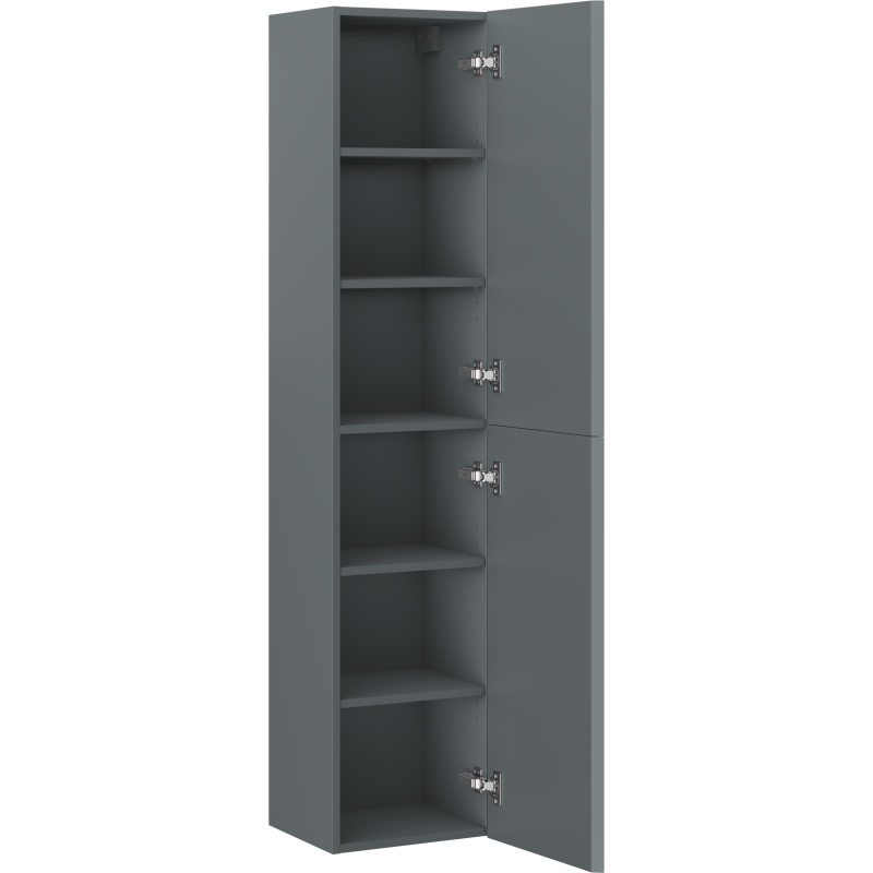 Špecifikácia produktu: Šírka: 35 cm Výška: 160 cm Hĺbka: 30 cm Farba korpusu: Matný grafit Materiál korpusu: Lakovaná doska Farba čela: Matný grafit Materiál čela: Lakovaná MDF doska Konštrukcia čela: Hladká Počet dvierok: 2 5 políc (1 pevn tlmeného dovierania Univerzálna montáž dvierok (ľavé/pravé) Povrch odolný voči UV žiareniu Produkt zmontovaný