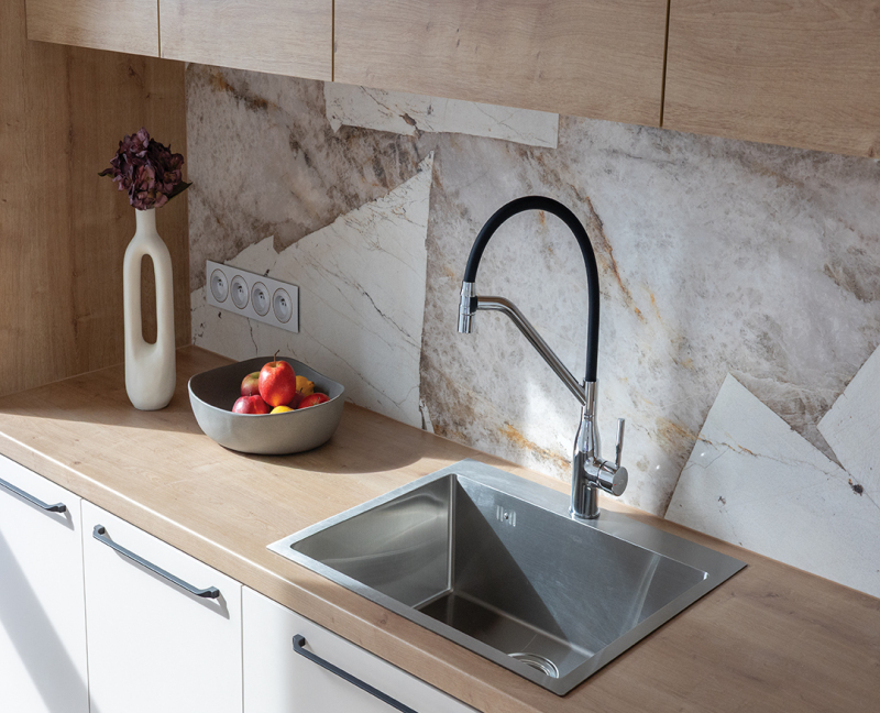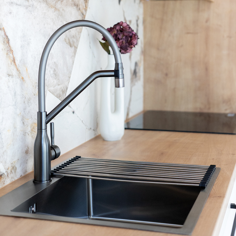 Batérie Colina sú k dispozícii v troch najtrendovejších farebných variantoch, ktoré sa bez problémov hodia do rôznych štýlov interiérov. Kombinácia chrómu a čiernej je elegantnou a nadčasovou voľbou pre tých, ktorí oceňujú kontrastné akcenty – lesklý chróm dodáva priestoru sviežosť, zatiaľ čo matná čierna umocňuje moderný charakter kuchyne. Pre tých, ktorí dávajú prednosť klasickej moderne, je batéria v jednotnej matne čiernej povrchovej úprave perfektným riešením - minimalistická, štýlová a skvele sa hodí do loftových, škandinávskych a industriálnych interiérov. Grafitová povrchová úprava sa vyznačuje jemnou kovovou textúrou, ktorá do kuchyne vnáša nádych sofistikovanosti a krásne ladí s betónovými pracovnými doskami, drevenými povrchmi a matnými čelami skriniek.