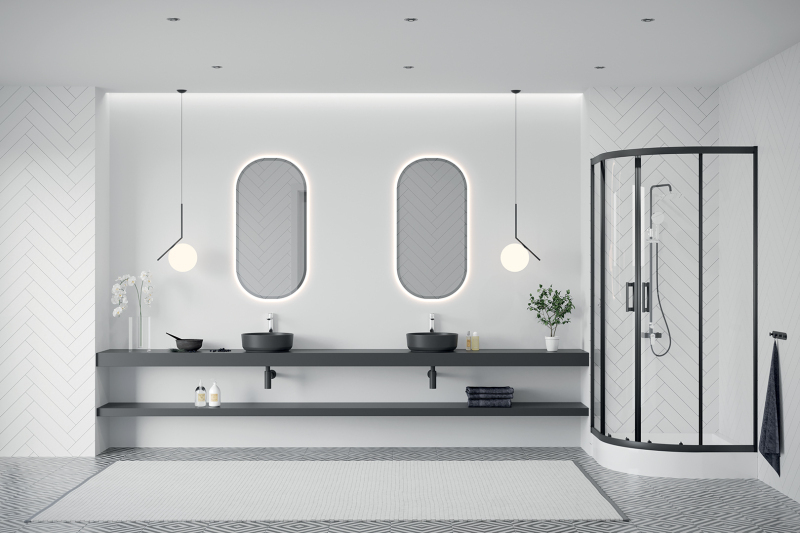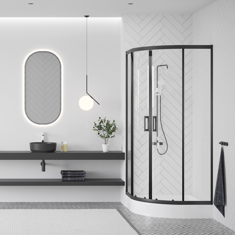 Ponorte sa do luxusu a modernity s naším polkruhovým sprchovacím kútom s rozmermi 90x90 cm. Pokiaľ hľadáte produkt, ktorý zdôrazní jedinečnosť vašej kúpeľne a dodá jej nádych moderného štýlu, je náš sprchovací kút perfektnou voľbou. Nechajte sa inšpirovať súčasnými trendmi a nechajte svoju kúpeľňu vyžarovať modernu a eleganciu! Tento kút s čiernou povrchovou úpravou je vyjadrením moderného štýlu a trendu, ktorý odráža súčasné preferencie v interiérovom dizajne.