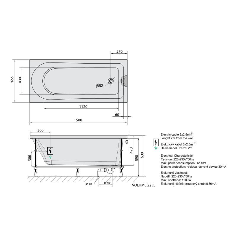 LISA hydromasážna vaňa, 150x70x47cm, Highline Hydro, chróm 57038