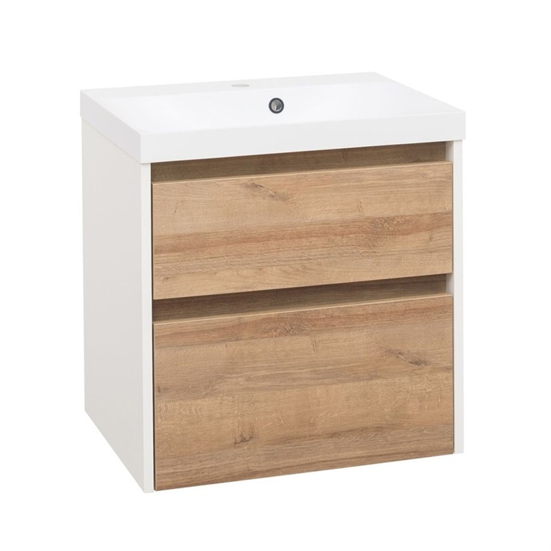 Opto, kúpeľňová skrinka, umývadlo z liateho mramoru, 610 mm, spodná, biela lesk / dub Riviera, 2 zásuvky. Možno kombinovať s keramickým umývadlom, príp. s kúpeľňovou doskou na skrinku alebo nábytkovým keramickým umývadlom. Zobraziť viac