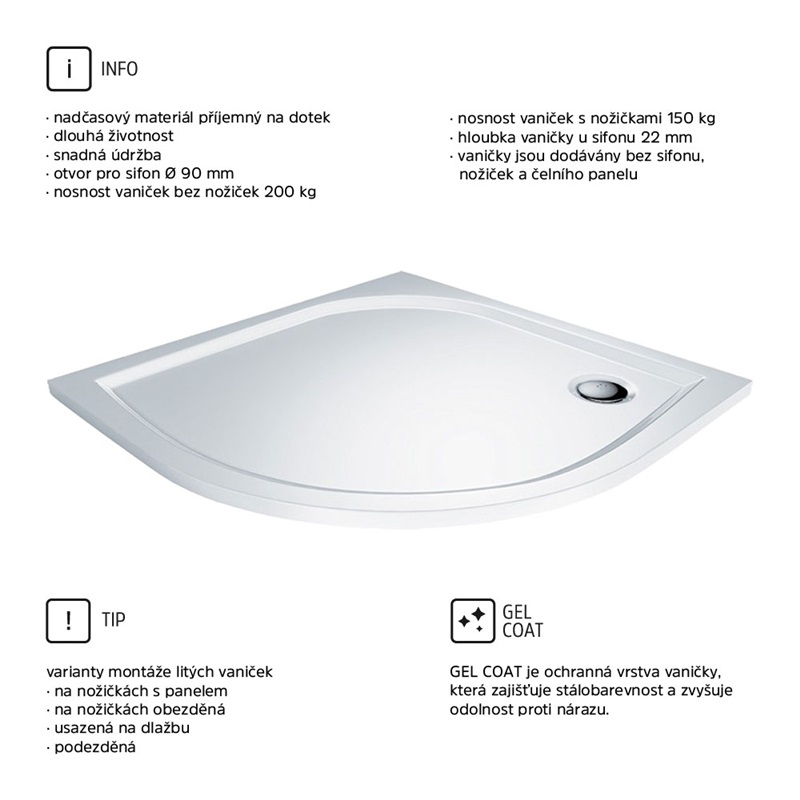 Sprchové vaničky z liateho mramoru sú opatrené ochrannou vrstvou Gelcoat, ktorá zaisťuje stálofarebnosť a odolnosť proti nárazu.