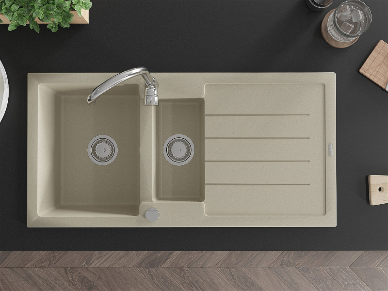 Mexen Andres 1,5-miskový granitový drez s odkvapkávačom a kuchynskou batériou Telma, béžová - 6515-69-670200-00
