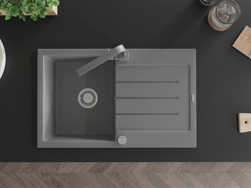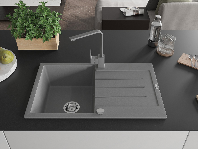 Mexen Bruno 1miskový granitový drez s odkvapkávačom a kuchynskou batériou Rita, šedá - 6513-71-670300-71