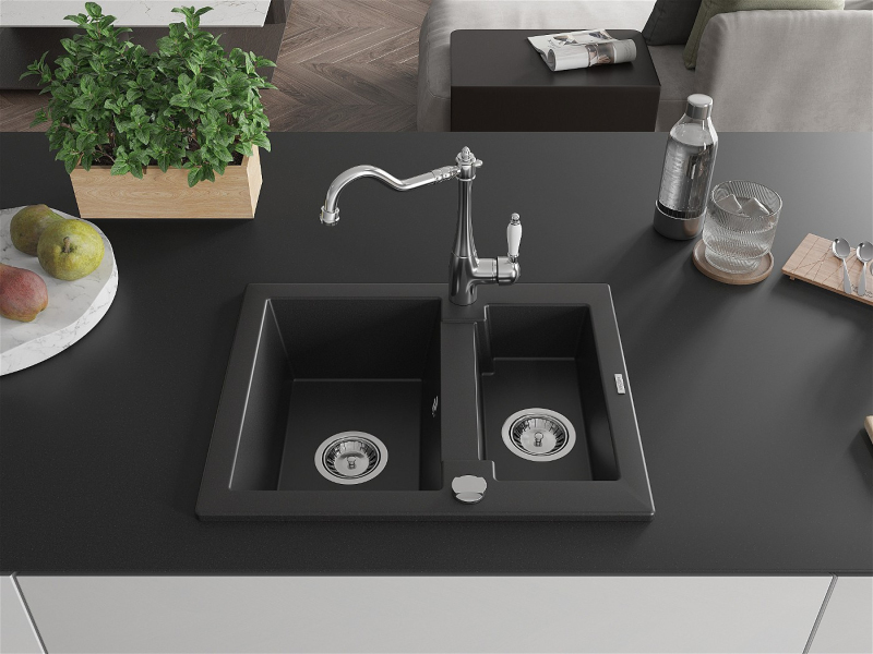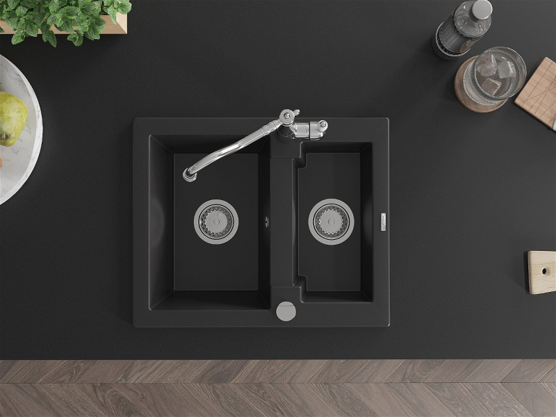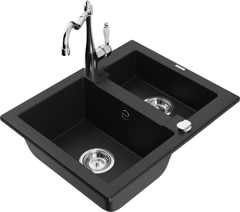 Mexen Carlos 1,5-miskový granitový drez s kuchynskou batériou Carla, čierna 6518-77-670700-00