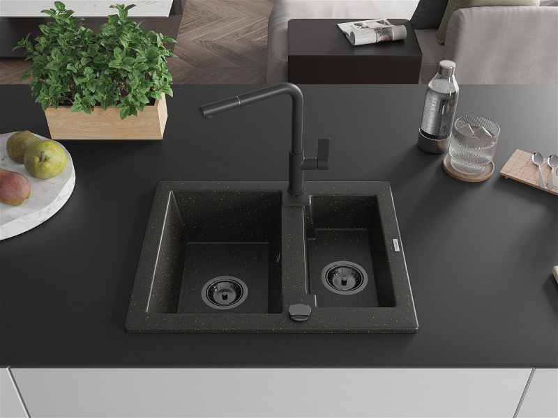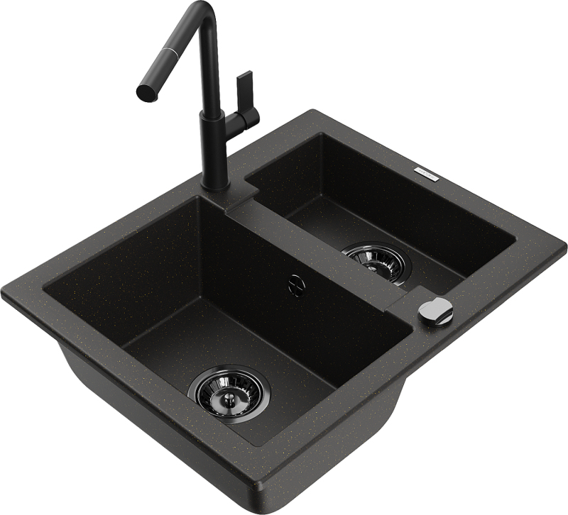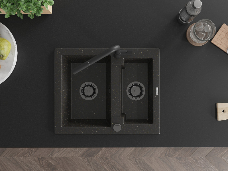 Mexen Carlos 1,5-miskový granitový drez s kuchynskou batériou Flora, čierna/zlatá metalíza - 6518-75-670401-70-B