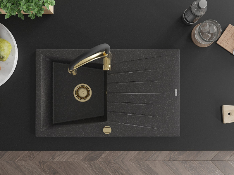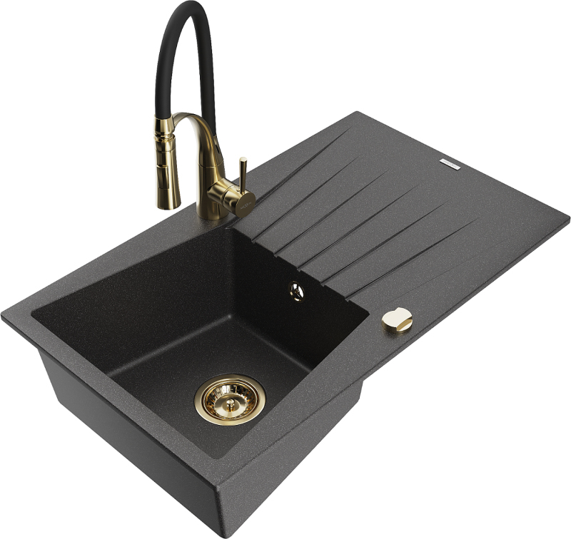 Mexen Cesar, 1-miskový granitový drez s odkvapkávačom a kuchynskou batériou Aster, škvrnitá čierna - 6514-76-73450-57-G