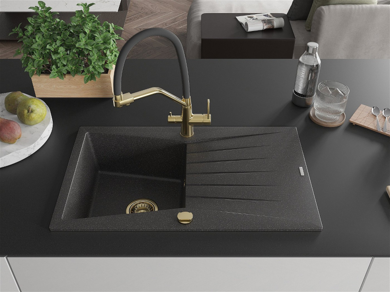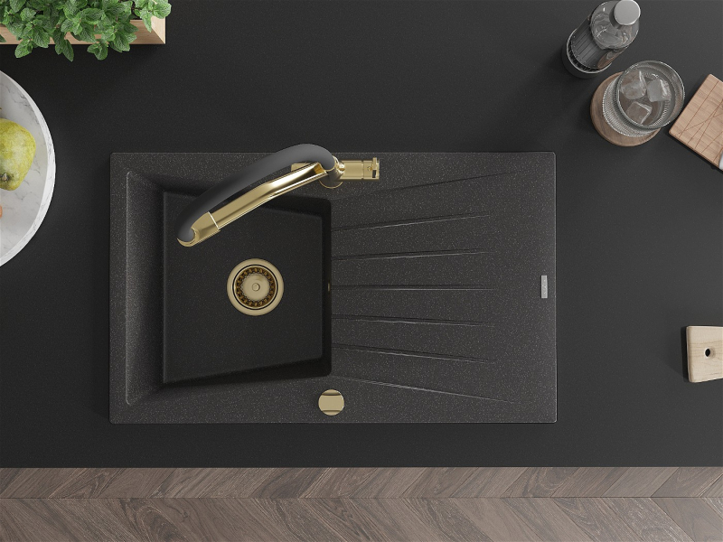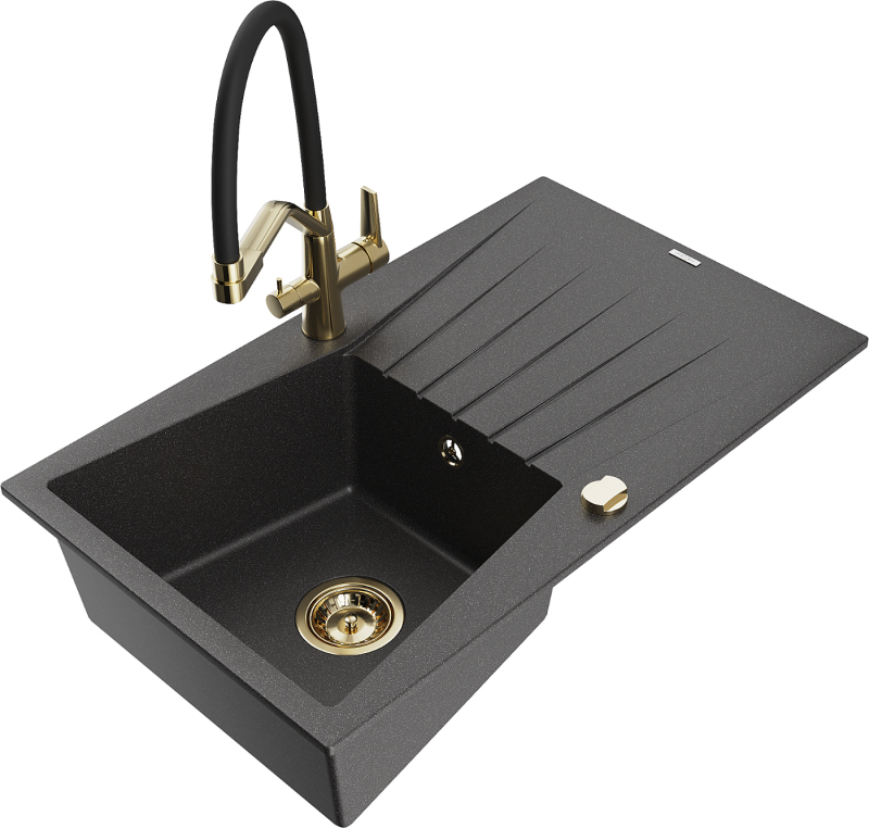 Mexen Cesar 1-miskový granitový drez s odkvapkávačom a kuchynskou batériou Duo, škvrnitá čierna - 6514-76-671701-57-G
