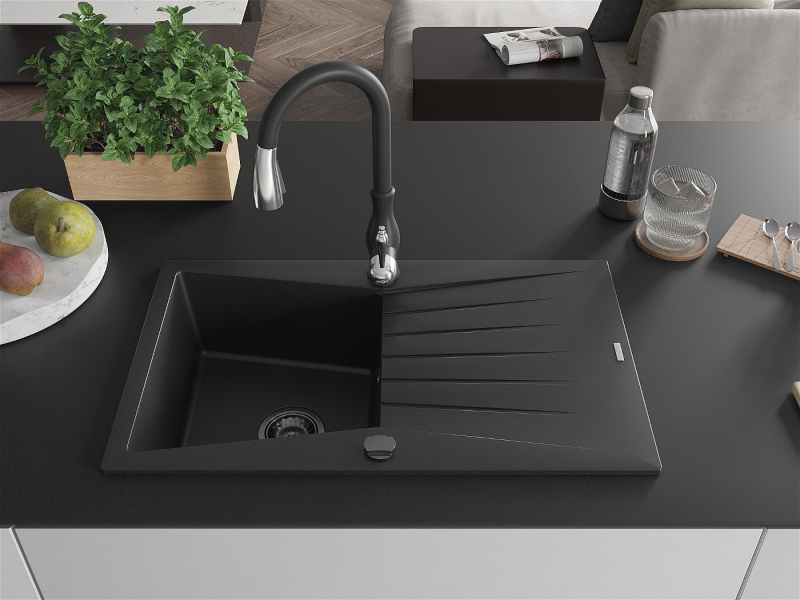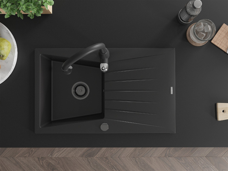 Mexen Cesar 1-miskový granitový drez s odkvapkávačom a kuchynskou batériou Savita, čierna - 6514-77-672601-70-B